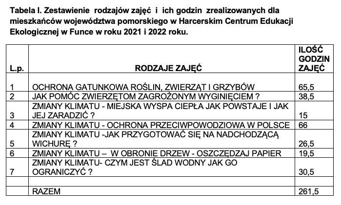 Łączna ilość osób z województwa pomorskiego korzystających z programu w latach 2021-2022 wyniosła 423. Wszyscy uczestnicy realizujący program edukacji ekologicznej w Harcerskim Centrum Edukacji Ekologicznej w Funce poinformowani zostali o dofinansowaniu działań programowych przez Wojewódzki Fundusz Ochrony Środowiska i Gospodarki Wodnej w Gdańsku.