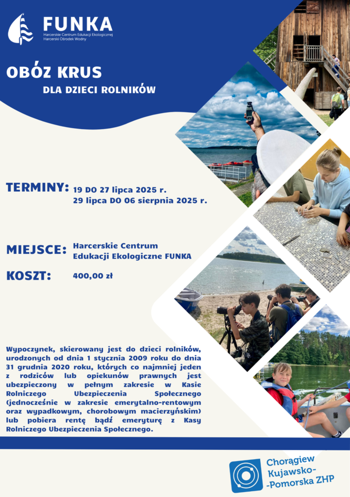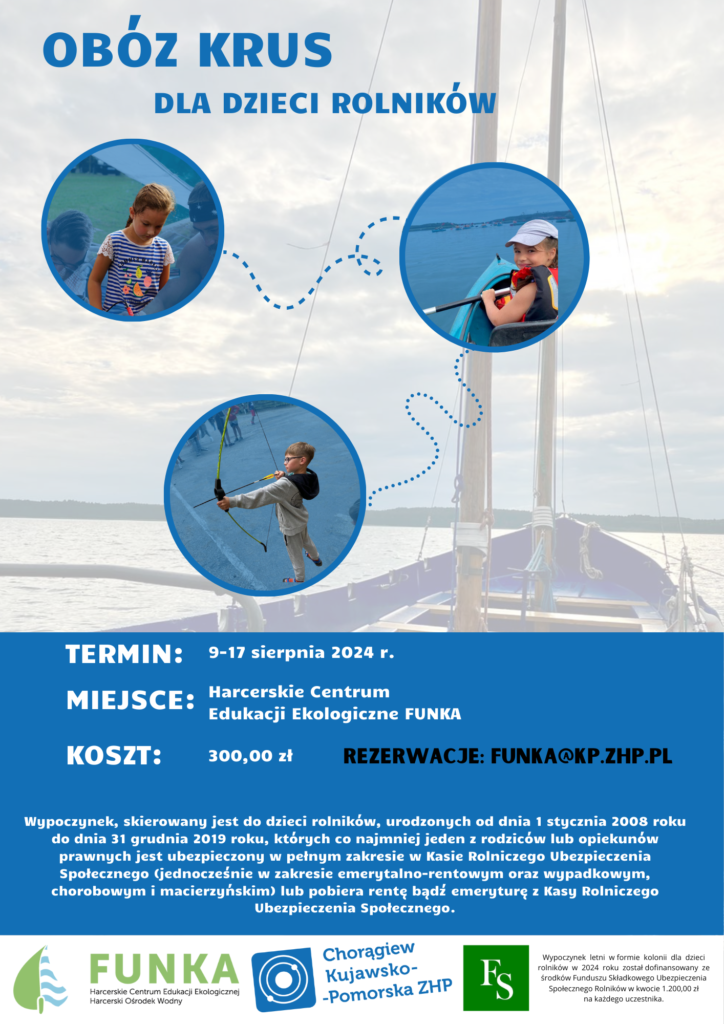 Zapraszamy dzieci rolników na kolonie w FUNKA Harcerskie Centrum Edukacji Ekologicznej. Termin kolonii – 09.08.2024 – 17.08.2024. Całkowity koszt uprawnionego uczestnika to 300 zł za osobę.